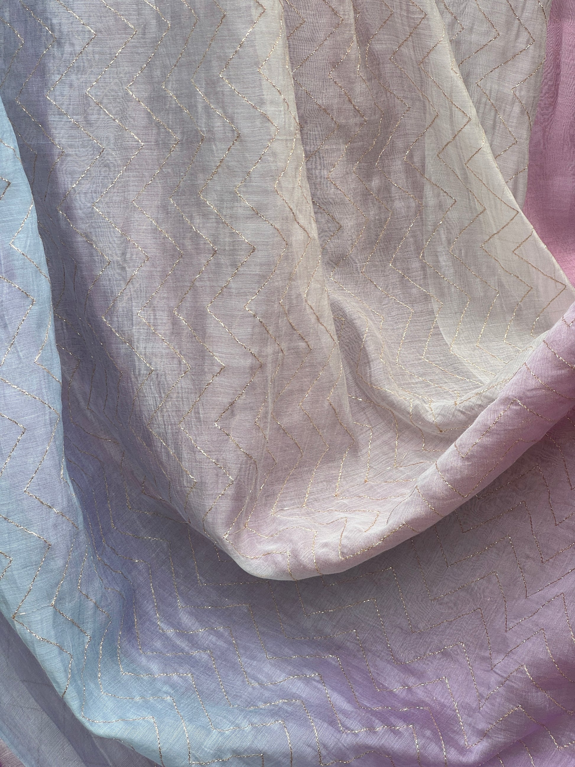 Experience the artistry of colors in motion with our signature ombré-dyed pure Banarasi Silk Chanderi fabrics. Seamlessly blending hues—now fading, then deepening—like a melody painted in light, each piece offers endless possibilities for soulful ensembles.