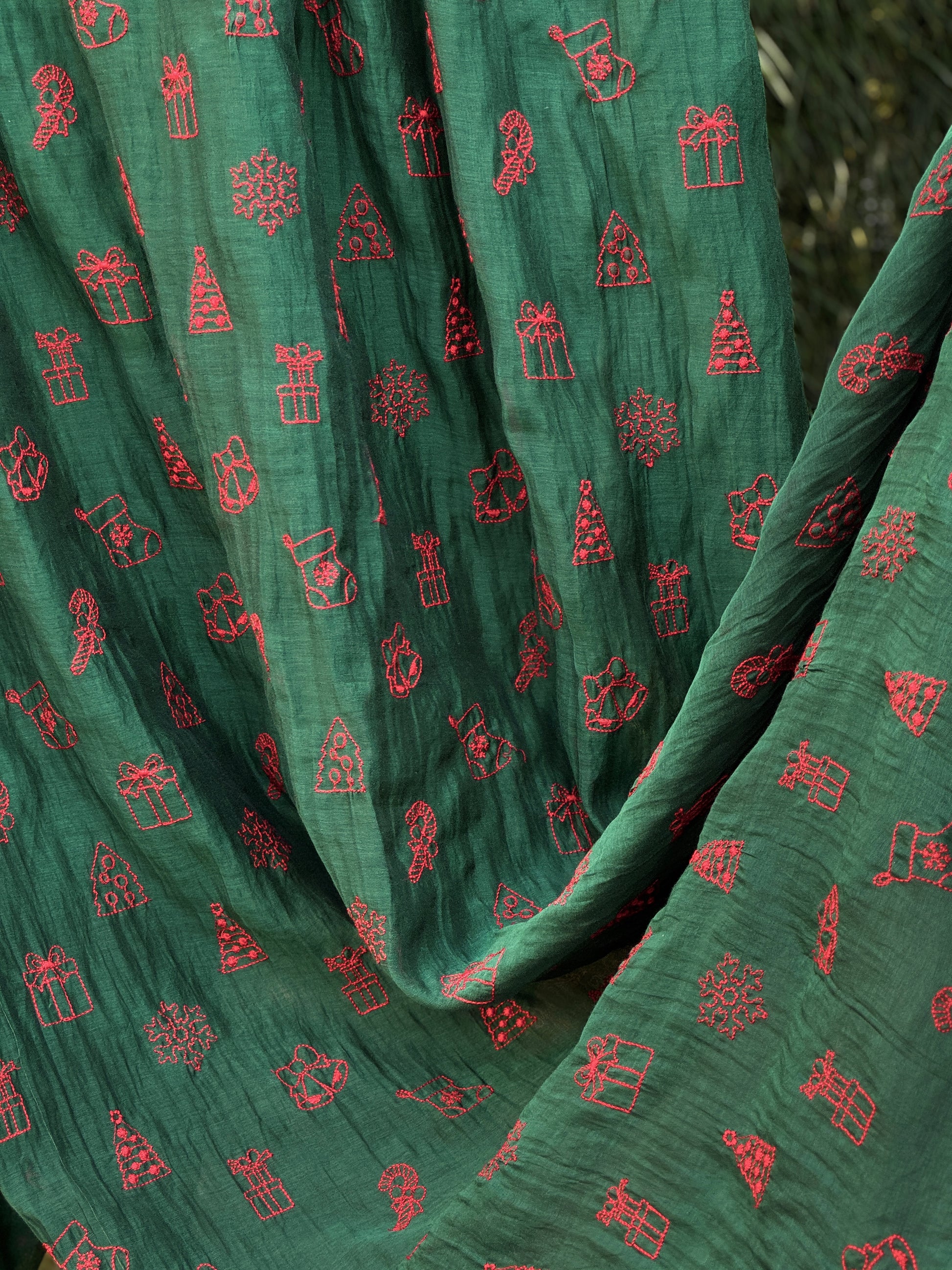 Soft, graceful, and touched with Christmas cheer — fine weave Banarasi Chanderi adorned with florals and festive motifs. In shades of red, white and green, this first-release edit is sure to bring home the season’s spirit and joy.
