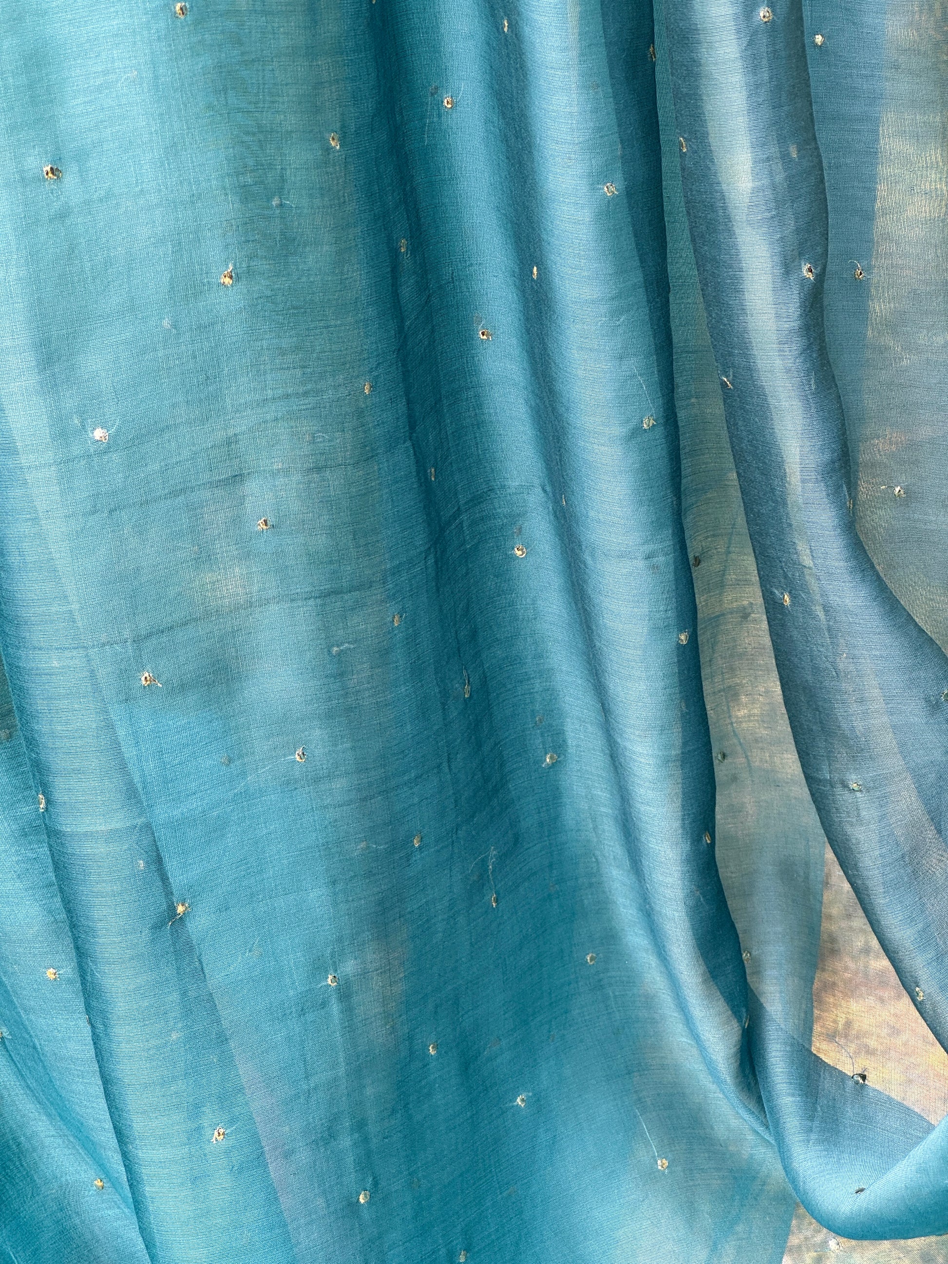 We took our much-loved ombré-dyed Silk Chanderi and traced it with zari embroidery reminiscent of mukaish handwork — a quiet scattering of gold drifting across a sea of slowly melting colours! Created with love and our heartfelt desire to bring you something truly special. ✨