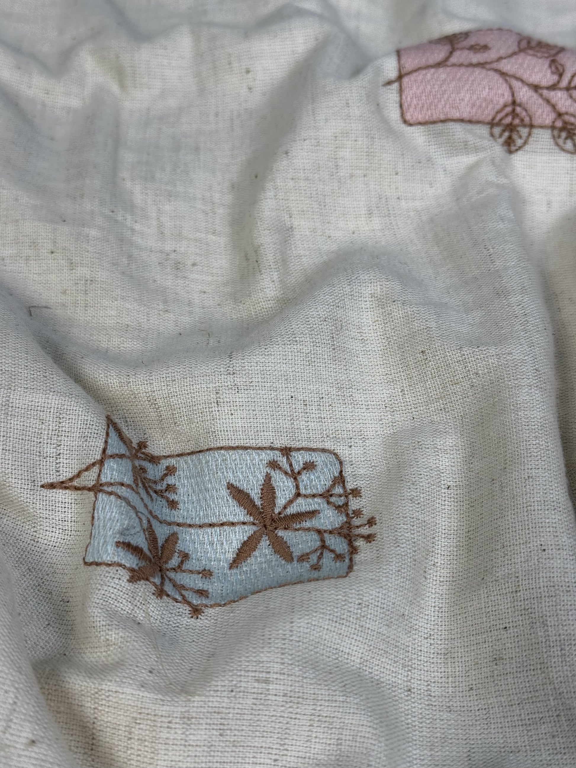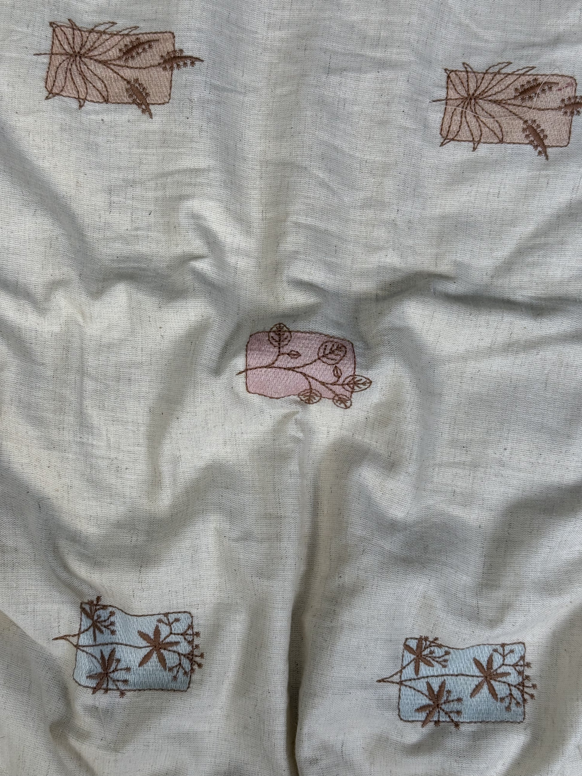 Pure Kora cotton fabric with delicate floral embroidery in pastel shades.