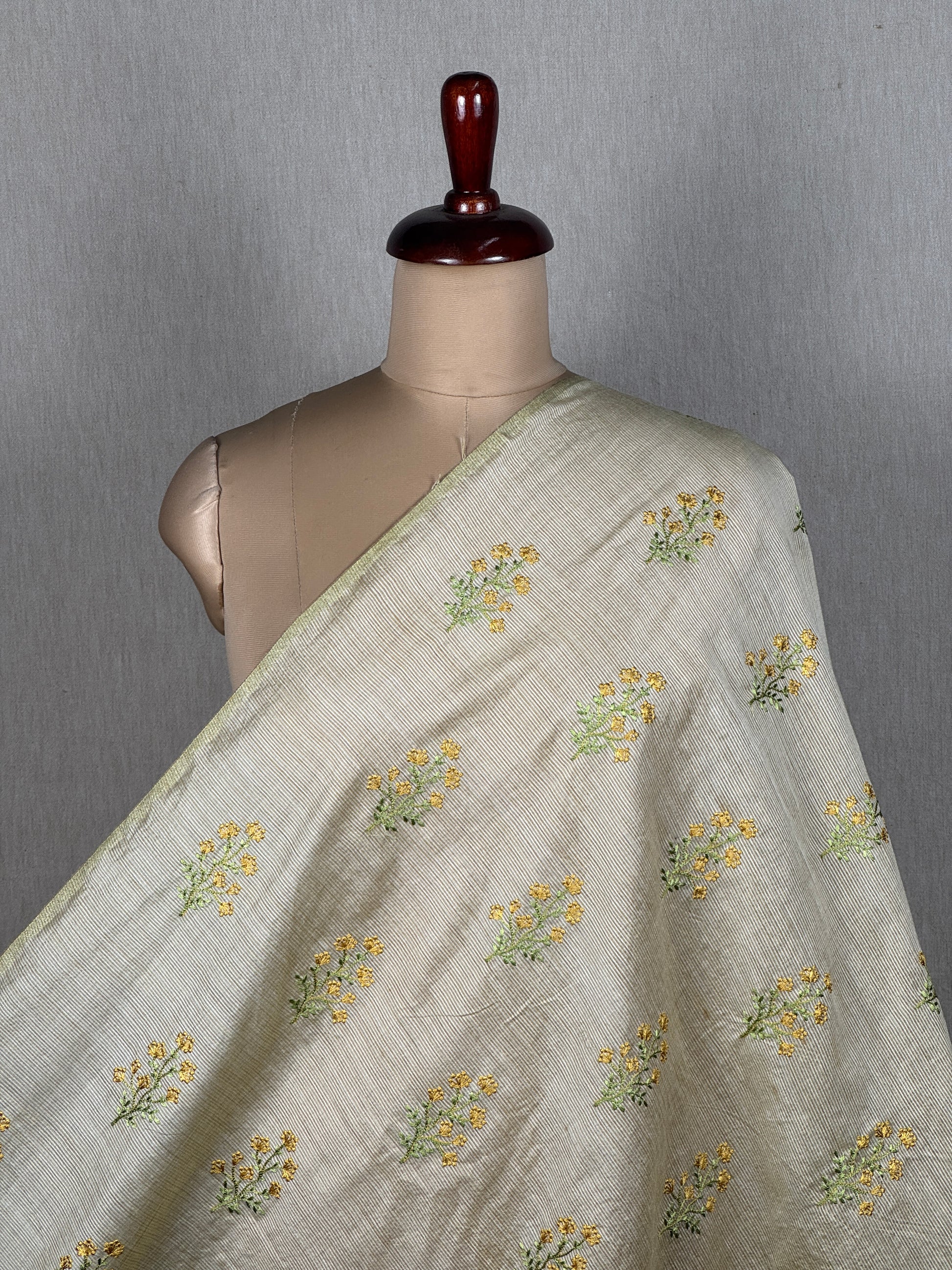 Set against a muted natural base, this linen Chandereri carries a quiet richness through delicate floral detailing and graceful texture. Refined and beautifully versatile.