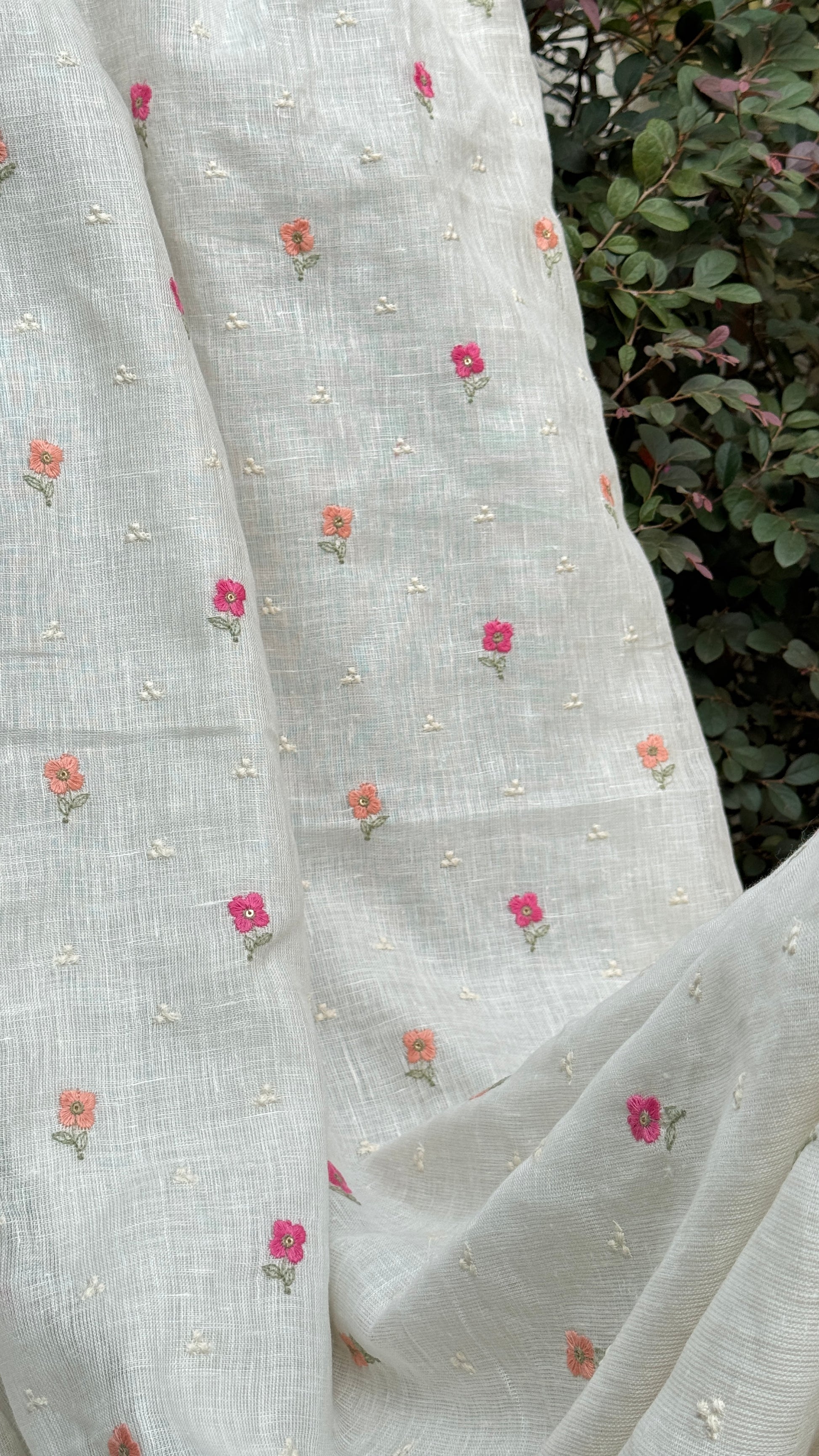 Celebrating the art of subtlety, our much-loved floral embroidery now adorns pure linen. With its unmatched quality, and graceful drape, this dyable fabric is a beautiful canvas awaiting your creative expression.