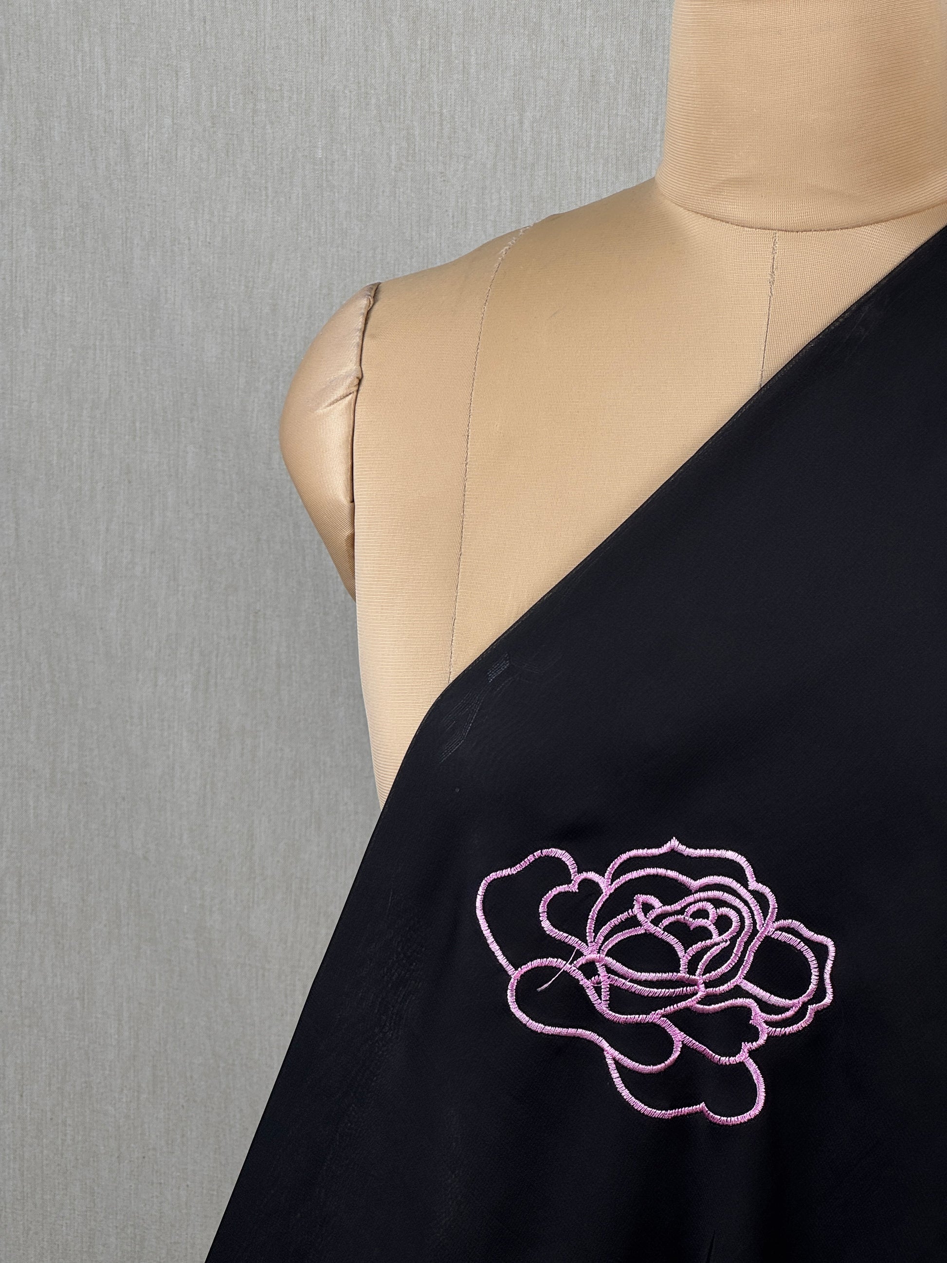 Minimalist roses on soft,  flowing organza. The translucent fabric and clean embroidery create a simple yet stunning look - a new addition to our designed fabric collection.
