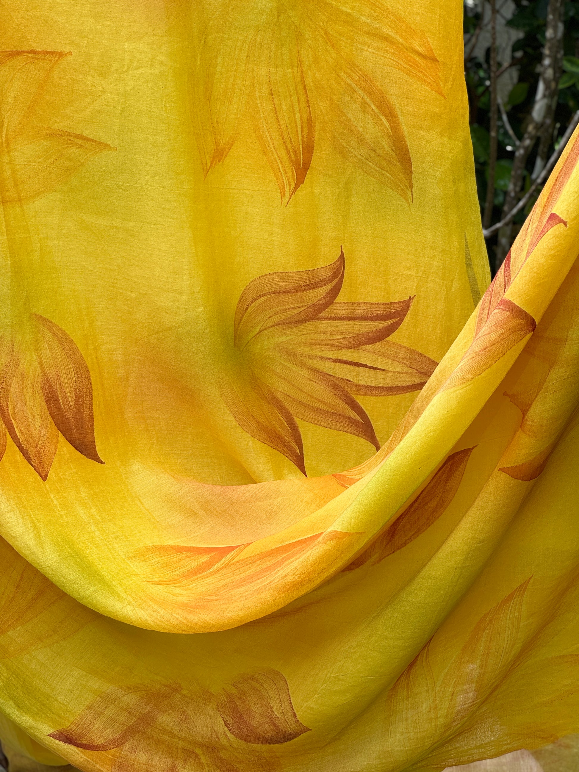 Feather–light 40gm Banarasi Chanderi, hand-painted with elegant, swooping strokes. Each brush movement reveals an artistry that flows across the fabric—fluid, expressive, graceful. A first of its kind, this fabric collection is crafted to be as rare as it is refined. Discover a fabric you won’t find elsewhere—yet.