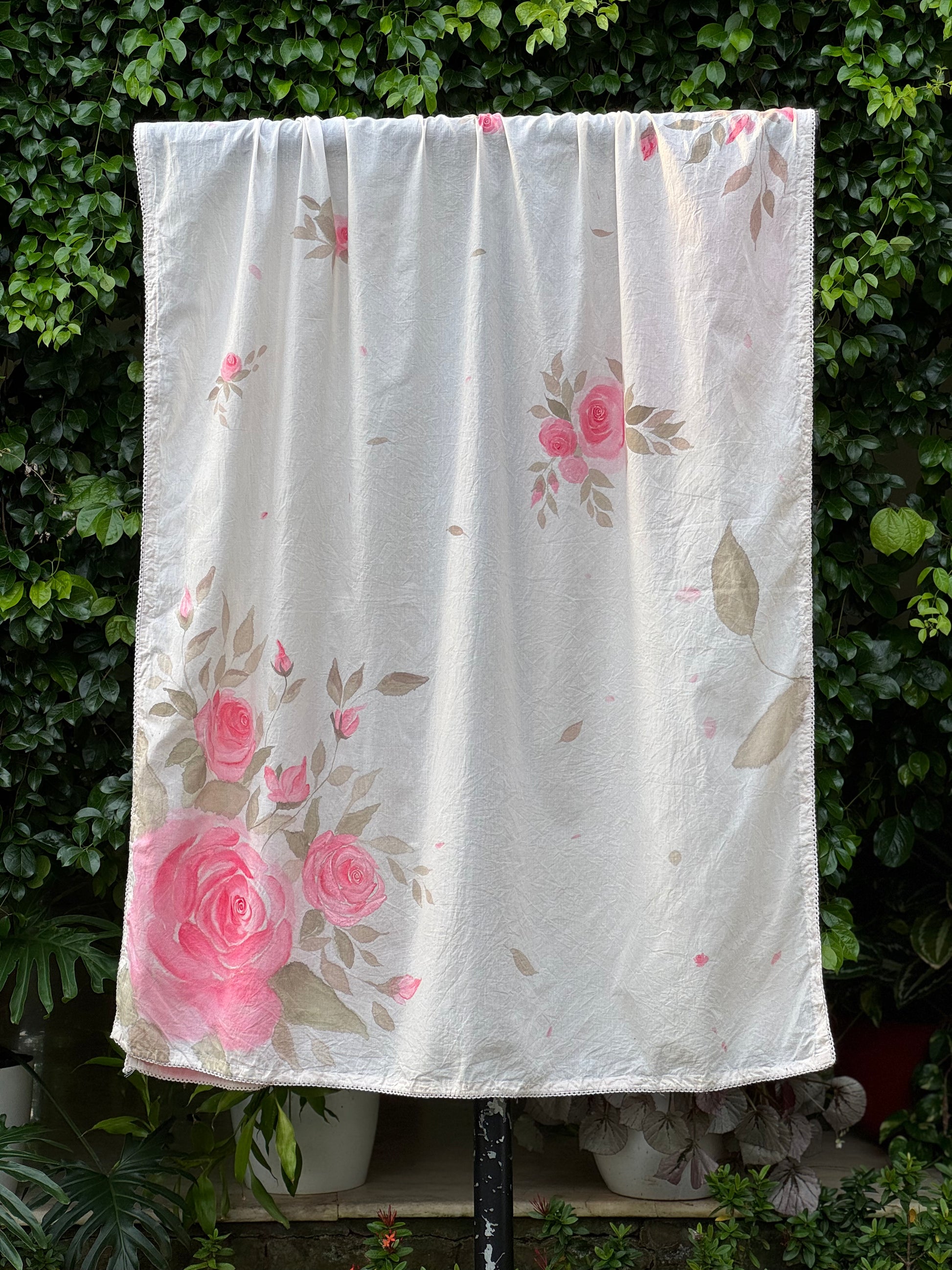 The dupatta was naturally dyed with tea for the earth-born tone and then hand-painted with fabric colours. Uniquely yours.